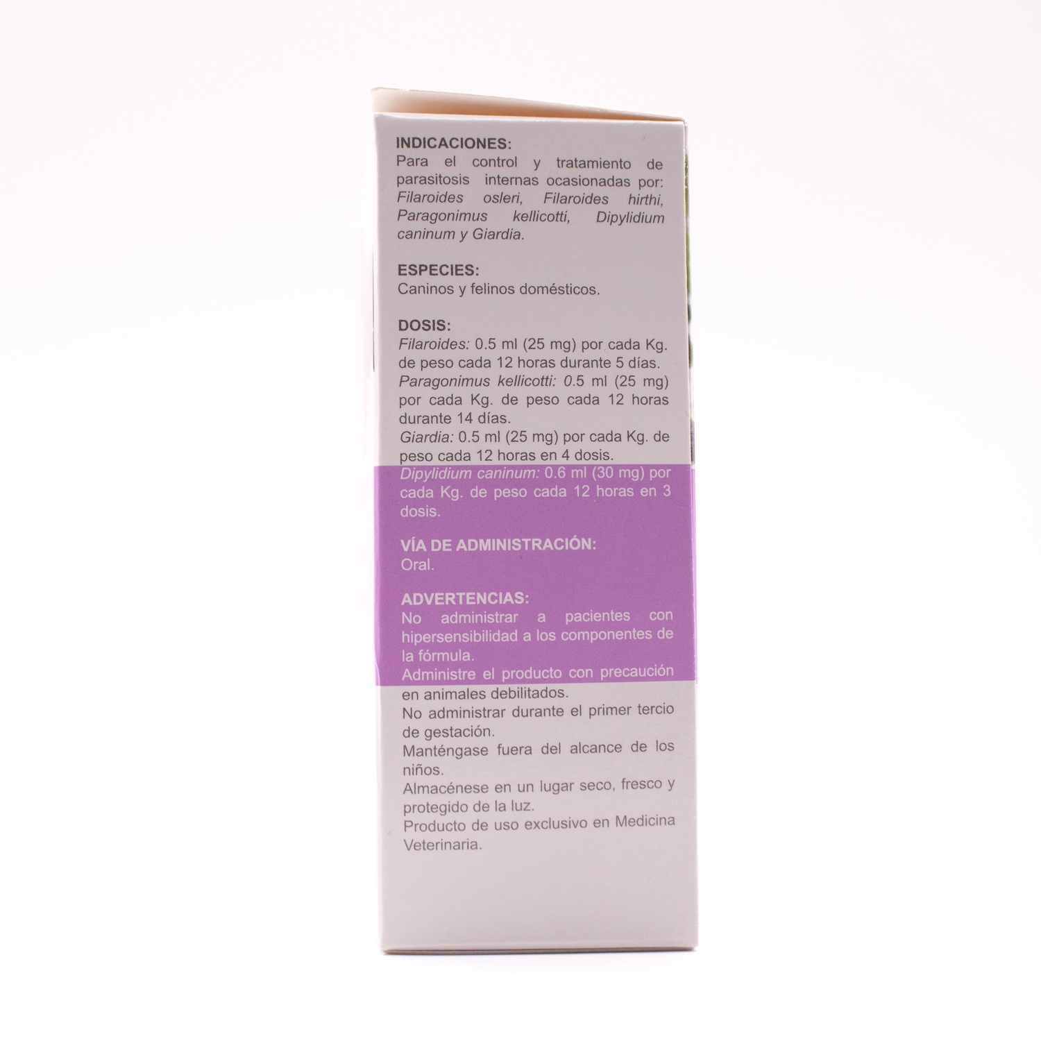 - Dipylidium caninum: 0.6 ml (30 mg) per kg of body weight every 12 hours for 3 doses.